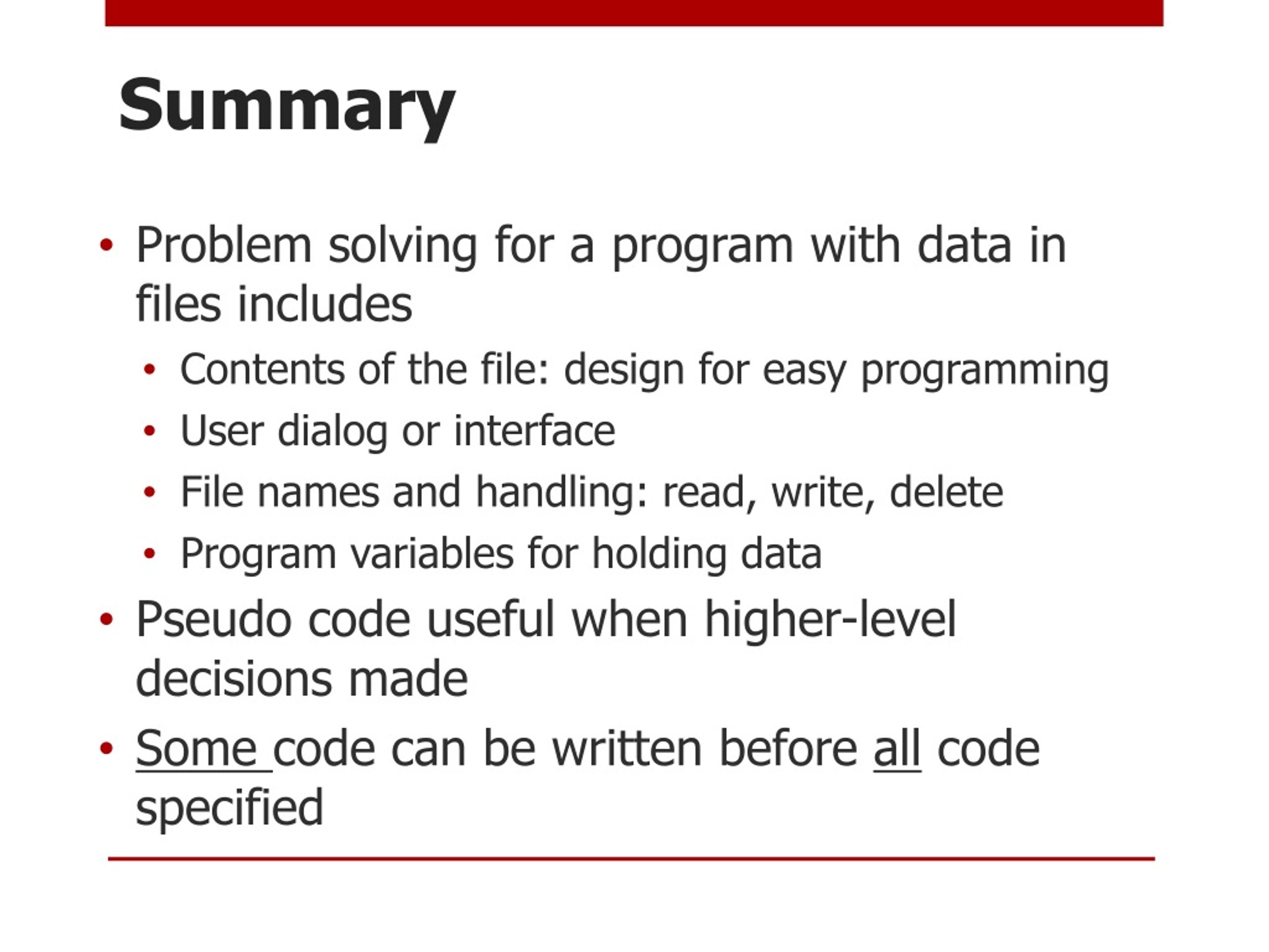 Summary • Problem solving for a program with data in files includes • Contents of the file: design for easy programming • User dialog or interface • File names and handling: read, write, delete • Program variables for holding data • Pseudo code useful when higher-level decisions made • Some code can be written before all code specified