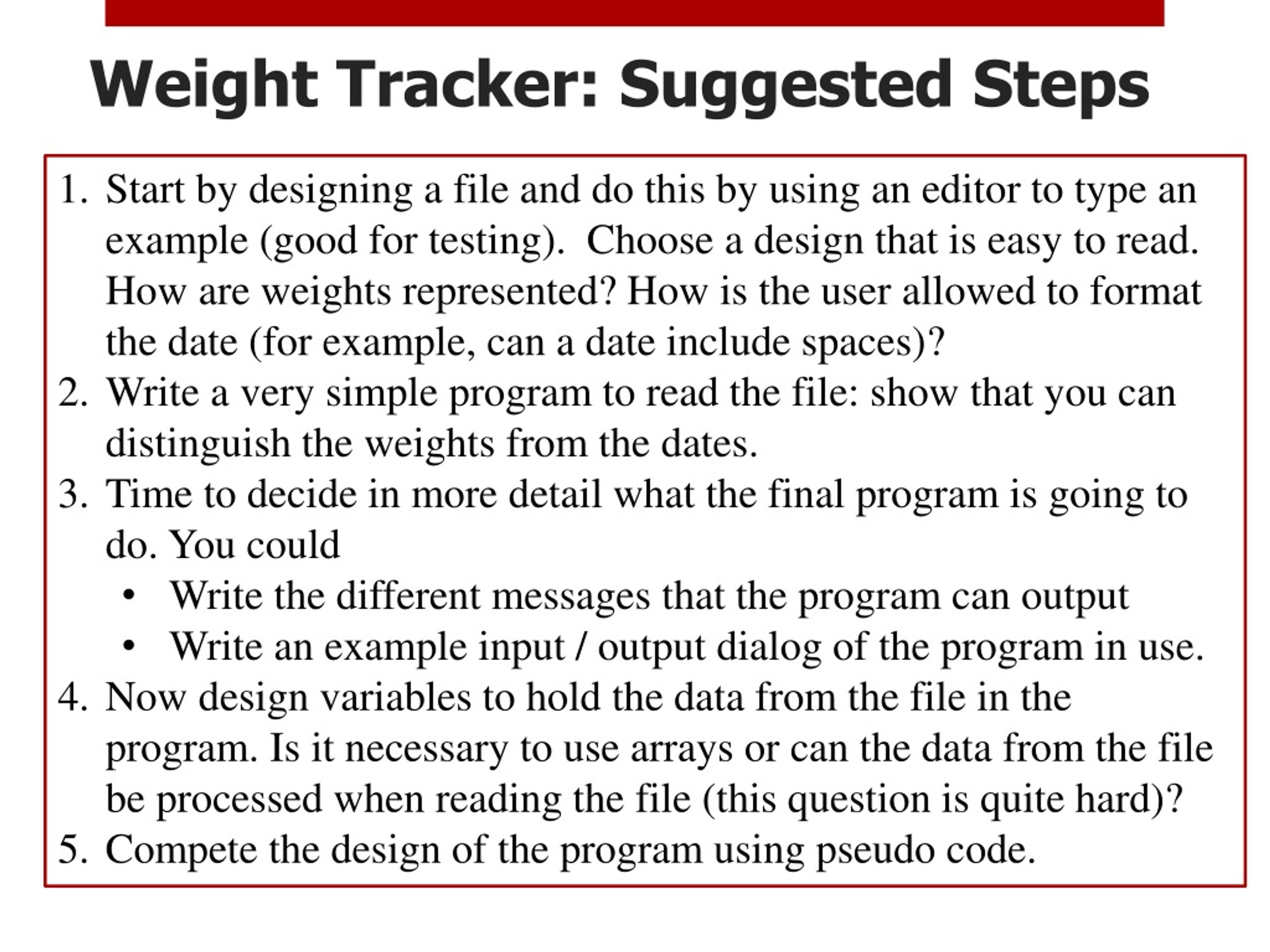 Weight Tracker: Suggested Steps • Start by designing a file and do this by using an editor to type an example (good for testing). Choose a design that is easy to read. How are weights represented? How is the user allowed to format the date (for example, can a date include spaces)? • Write a very simple program to read the file: show that you can distinguish the weights from the dates. • Time to decide in more detail what the final program is going to do. You could • Write the different messages that the program can output • Write an example input / output dialog of the program in use. • Now design variables to hold the data from the file in the program. Is it necessary to use arrays or can the data from the file be processed when reading the file (this question is quite hard)? • Compete the design of the program using pseudo code.