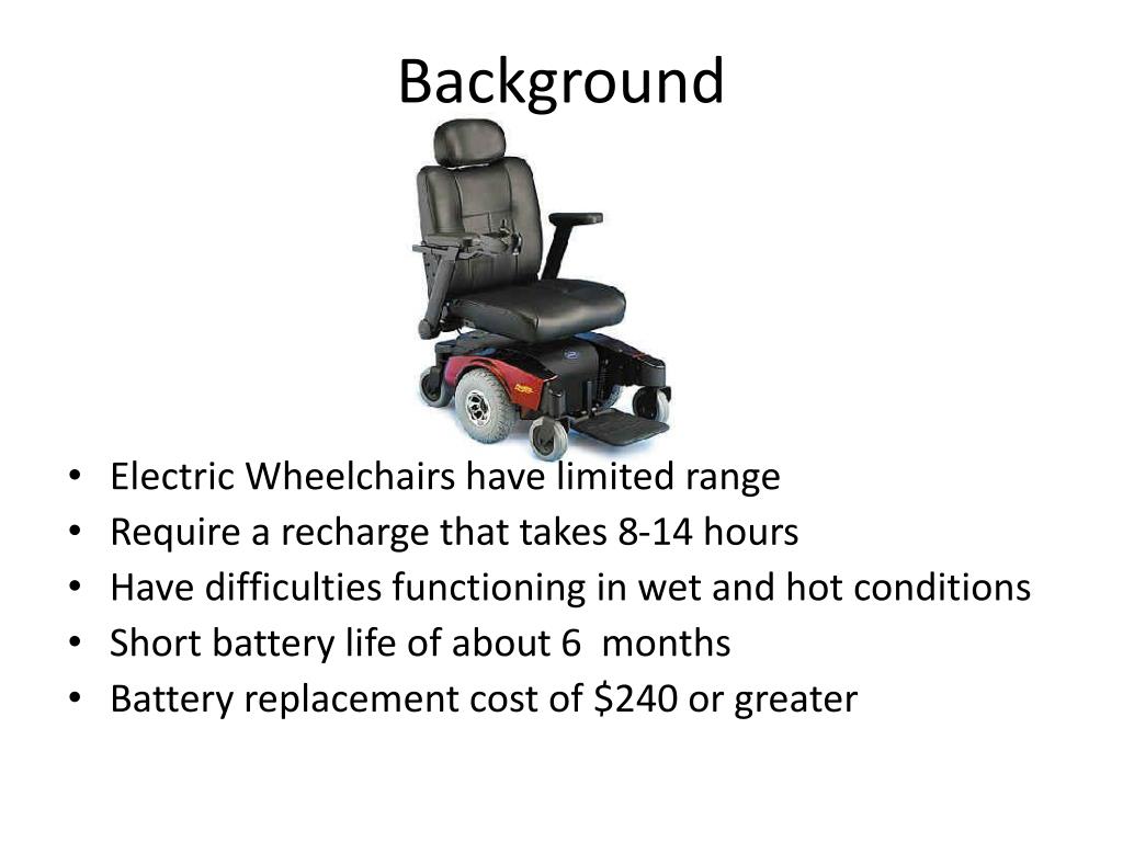 Background • Electric Wheelchairs have limited range • Require a recharge that takes 8-14 hours • Have difficulties functioning in wet and hot conditions • Short battery life of about6 months • Battery replacement cost of $240 or greater