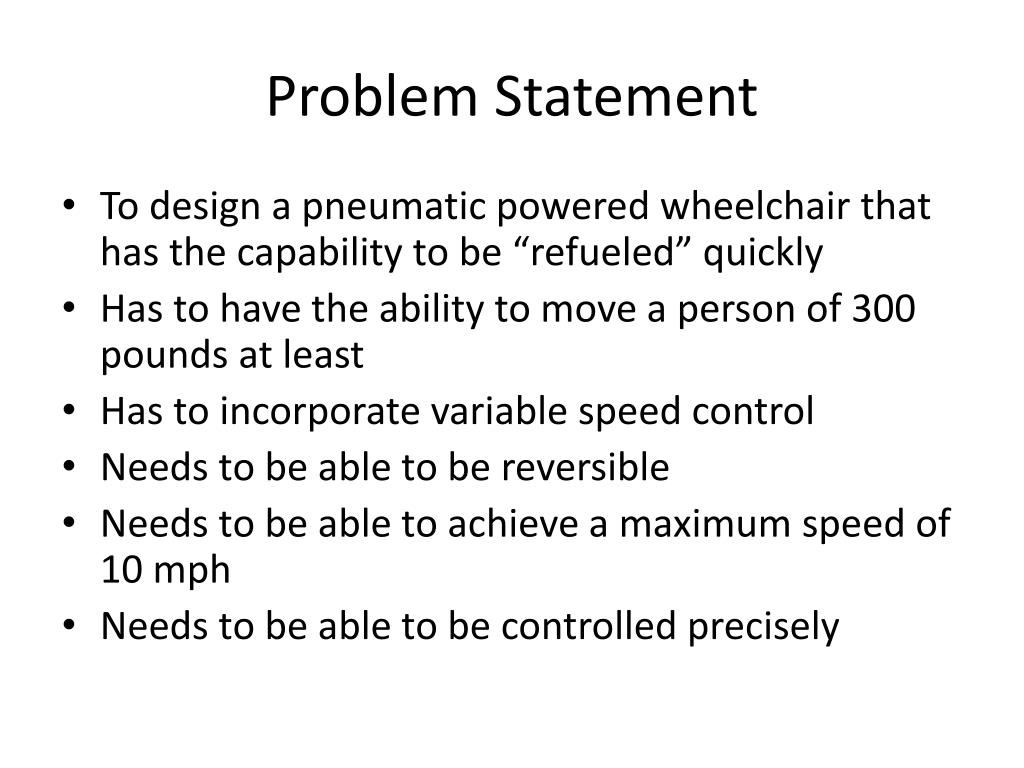 Problem Statement • To design a pneumatic powered wheelchair that has the capability to be “refueled” quickly • Has to have the ability to move a person of 300 pounds at least • Has to incorporate variable speed control • Needs to be able to be reversible • Needs to be able to achieve a maximum speed of 10 mph • Needs to be able to be controlled precisely