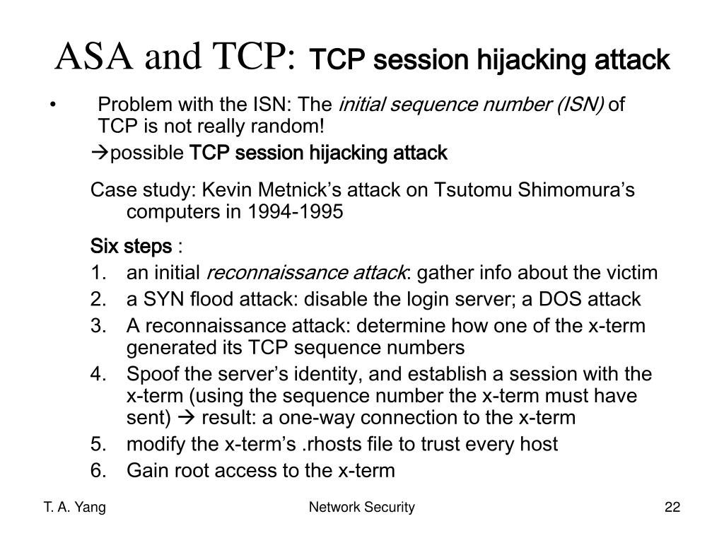 ASA and TCP:TCP session hijackingattack • Problem with the ISN: The initial sequence number (ISN) of TCP is not really random! possible TCP session hijackingattack Case study: Kevin Metnick’s attack on Tsutomu Shimomura’s computers in 1994-1995 Six steps : • an initial reconnaissance attack: gather info about the victim • a SYN flood attack: disable the login server; a DOS attack • A reconnaissance attack: determine how one of the x-term generated its TCP sequence numbers • Spoof the server’s identity, and establish a session with the x-term (using the sequence number the x-term must have sent) result: a one-way connection to the x-term • modify the x-term’s .rhosts file to trust every host • Gain root access to the x-term Network Security