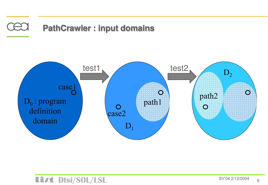 test1 test2 PathCrawler : input domains D0 : program definition domain D2 path2 case1 path1 case2 D1 case3