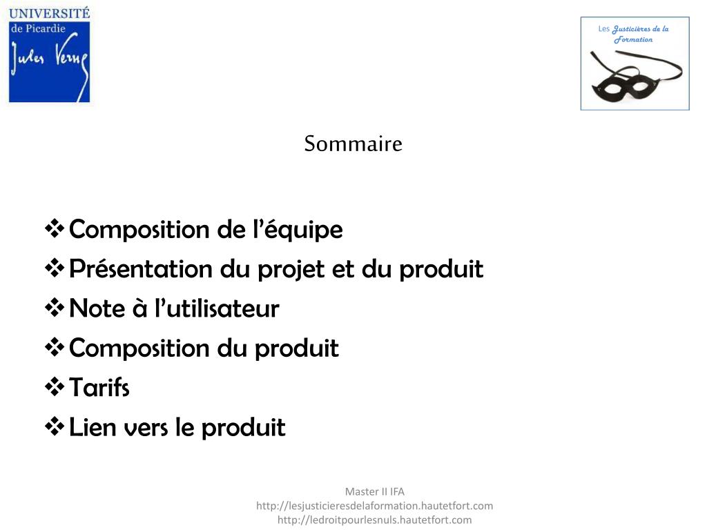 Les JusticièresdelaFormation Sommaire • Composition de l’équipe • Présentation du projet et du produit • Note à l’utilisateur • Composition du produit • Tarifs • Lien vers le produit Master II IFA http://lesjusticieresdelaformation.hautetfort.com http://ledroitpourlesnuls.hautetfort.com