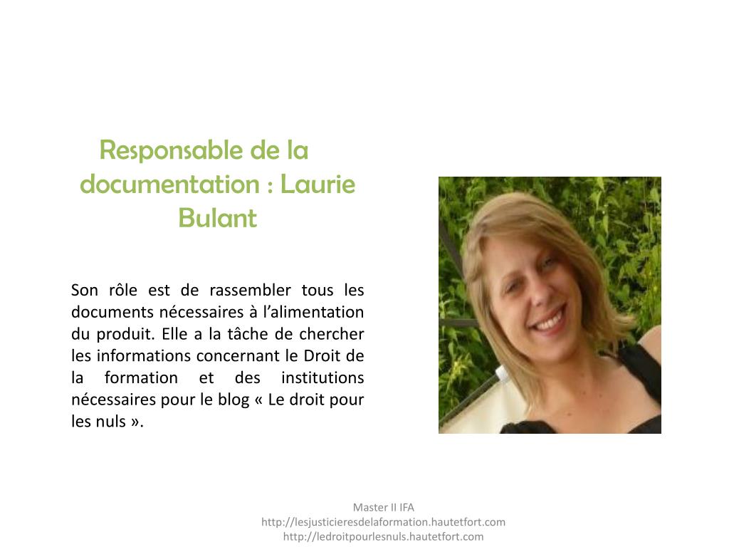 Responsable de la documentation : Laurie Bulant Son rôle est de rassembler tous les documents nécessaires à l’alimentation du produit. Elle a la tâche de chercher les informations concernant le Droit de la formation et des institutions nécessaires pour le blog « Le droit pour les nuls ». Master II IFA http://lesjusticieresdelaformation.hautetfort.com http://ledroitpourlesnuls.hautetfort.com
