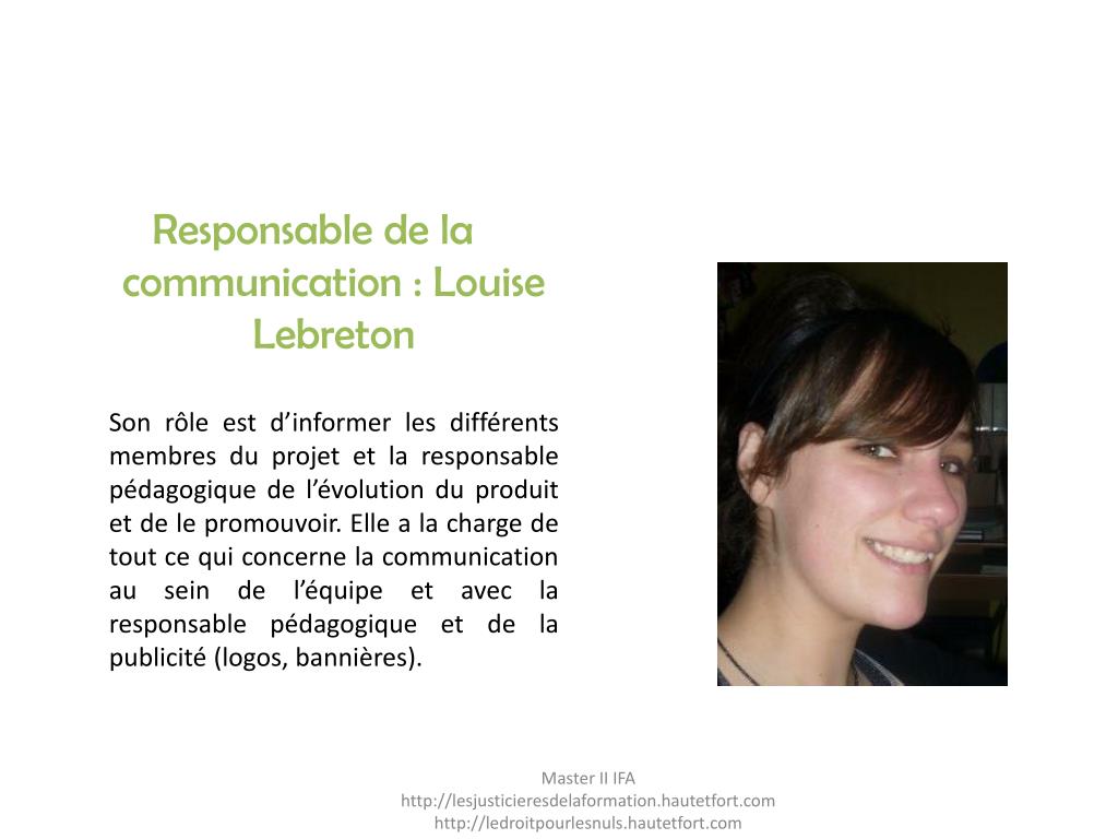 Responsable de la communication : Louise Lebreton Son rôle est d’informer les différents membres du projet et la responsable pédagogique de l’évolution du produit et de le promouvoir. Elle a la charge de tout ce qui concerne la communication au sein de l’équipe et avec la responsable pédagogique et de la publicité (logos, bannières). Master II IFA http://lesjusticieresdelaformation.hautetfort.com http://ledroitpourlesnuls.hautetfort.com
