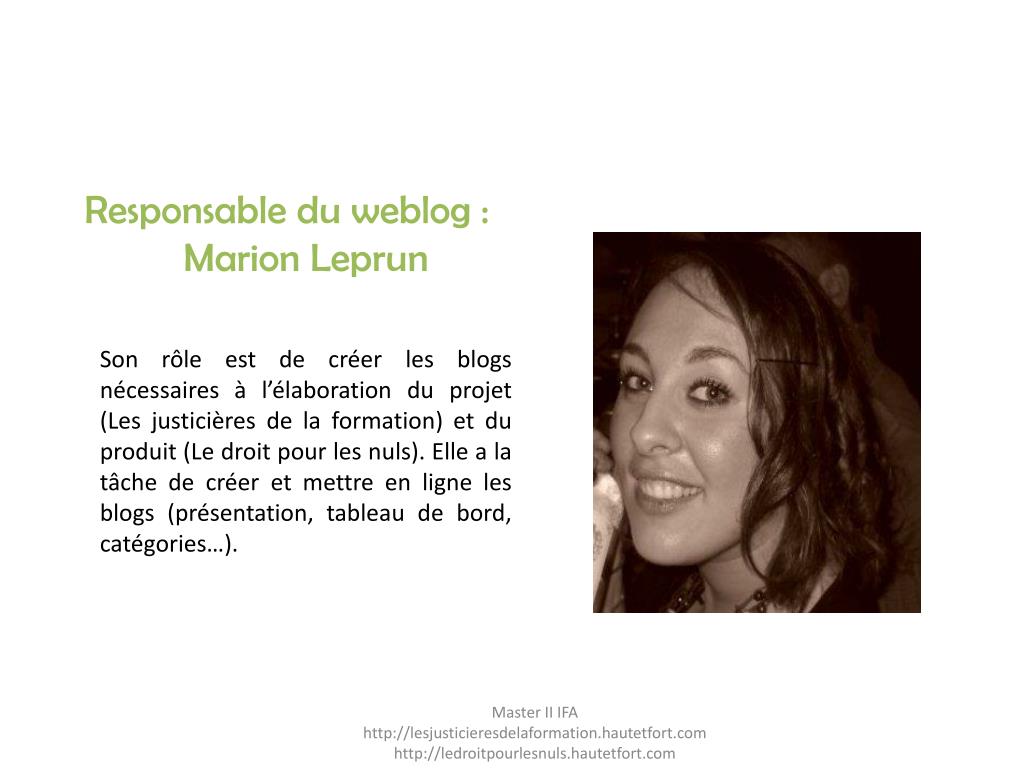 Responsable du weblog : Marion Leprun Son rôle est de créer les blogs nécessaires à l’élaboration du projet (Les justicières de la formation) et du produit (Le droit pour les nuls). Elle a la tâche de créer et mettre en ligne les blogs (présentation, tableau de bord, catégories…). Master II IFA http://lesjusticieresdelaformation.hautetfort.com http://ledroitpourlesnuls.hautetfort.com