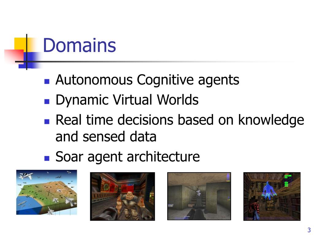 Domains • Autonomous Cognitive agents • Dynamic Virtual Worlds • Real time decisions based on knowledge and sensed data • Soar agent architecture