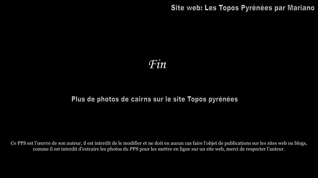 Site web: Les Topos Pyrénées par Mariano Fin Plus de photos de cairns sur le site Topos pyrénées Ce PPS est l’œuvre de son auteur, il est interdit de le modifier et ne doit en aucun cas faire l’objet de publications sur les sites web ou blogs, comme il est interdit d’extraire les photos du PPS pour les mettre en ligne sur un site web, merci de respecter l’auteur. . . . . . .