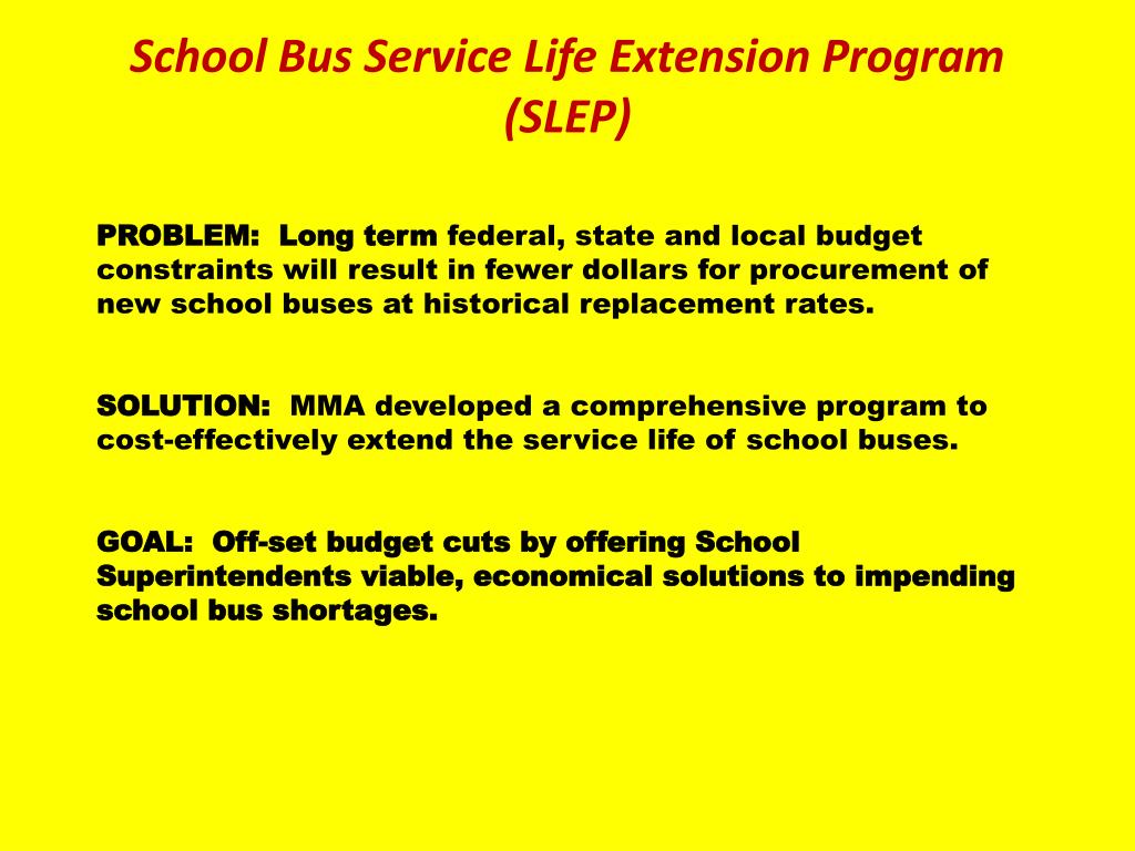 School Bus Service Life Extension Program(SLEP) PROBLEM: Long term federal, state and local budget constraints will result in fewer dollars for procurement of new school buses at historical replacement rates. SOLUTION: MMA developed a comprehensive program to cost-effectively extend the service life of school buses.GOAL: Off-set budget cuts by offering School Superintendents viable, economical solutions to impending school bus shortages.