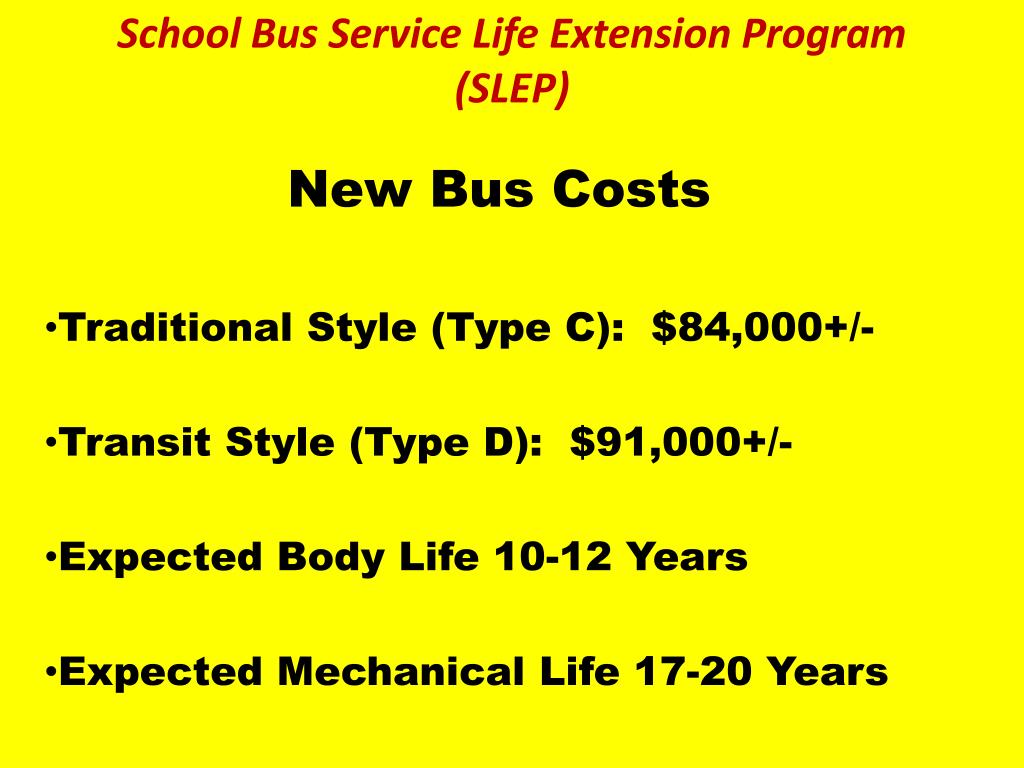 School Bus Service Life Extension Program(SLEP) New Bus Costs Traditional Style (Type C): $84,000+/- Transit Style (Type D): $91,000+/- Expected Body Life 10-12 Years Expected Mechanical Life 17-20 Years