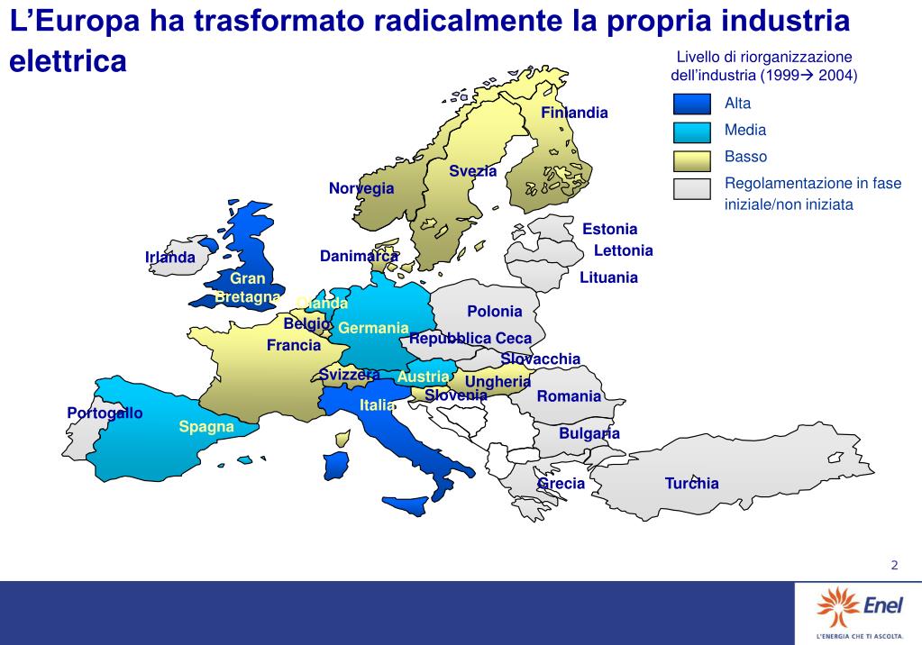 L’Europa ha trasformato radicalmente la propria industria elettrica Livello di riorganizzazione dell’industria (1999 2004) Alta Media Basso Regolamentazione in fase iniziale/non iniziata Finlandia Svezia Norvegia Estonia Lettonia Danimarca Irlanda Lituania Gran Bretagna Olanda Polonia Belgio Germania Repubblica Ceca Francia Slovacchia Svizzera Austria Ungheria Slovenia Romania Italia Portogallo Spagna Bulgaria Grecia Turchia