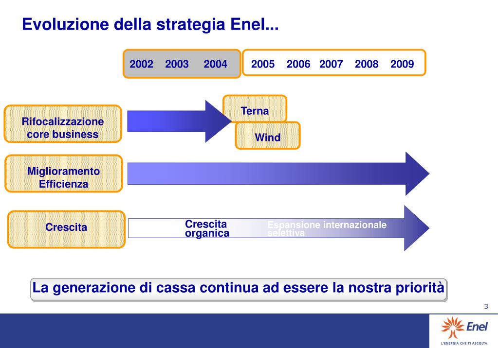 Evoluzione della strategia Enel... 2002 2003 20042005 2006 2007 2008 2009 Terna Rifocalizzazione core business Wind Miglioramento Efficienza Crescita Crescita organica Espansione internazionale selettiva La generazione di cassa continua ad essere la nostra priorità