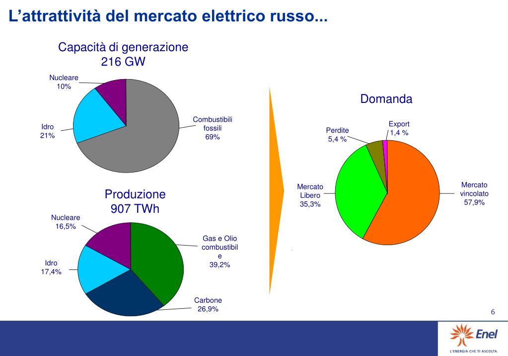L’attrattività del mercato elettrico russo... Capacitàdi generazione 216 GW Nucleare 10% Domanda Combustibilifossili 69% Export 1,4 % Idro 21% Perdite 5,4 % Mercato vincolato 57,9% Mercato Libero 35,3% Produzione 907 TWh Nucleare 16,5% Gas e Olio combustibile 39,2% Idro 17,4% Carbone 26,9%