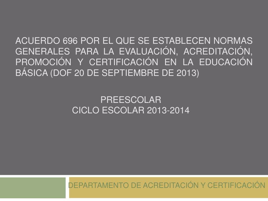 ACUERDO 696 POR EL QUE SE ESTABLECEN NORMAS GENERALES PARA LA EVALUACIÓN, ACREDITACIÓN, PROMOCIÓN Y CERTIFICACIÓN EN LA EDUCACIÓN BÁSICA (DOF 20 DE SEPTIEMBRE DE 2013) PREESCOLAR CICLO ESCOLAR 2013-2014 DEPARTAMENTO DE ACREDITACIÓN Y CERTIFICACIÓN