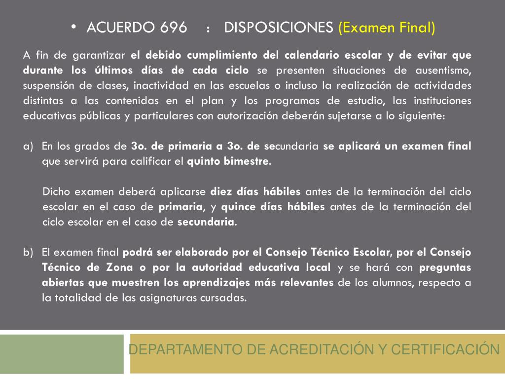 ACUERDO 696 : DISPOSICIONES (Examen Final) A fin de garantizar el debido cumplimiento del calendario escolar y de evitar que durante los últimos días de cada ciclo se presenten situaciones de ausentismo, suspensión de clases, inactividad en las escuelas o incluso la realización de actividades distintas a las contenidas en el plan y los programas de estudio, las instituciones educativas públicas y particulares con autorización deberán sujetarse a lo siguiente: En los grados de 3o. de primaria a 3o. de secundaria se aplicará un examen final que servirá para calificar el quinto bimestre. Dicho examen deberá aplicarse diez días hábiles antes de la terminación del ciclo escolar en el caso de primaria, y quince días hábiles antes de la terminación del ciclo escolar en el caso de secundaria. El examen final podrá ser elaborado por el Consejo Técnico Escolar, por el Consejo Técnico de Zona o por la autoridad educativa local y se hará con preguntas abiertas que muestren los aprendizajes más relevantes de los alumnos, respecto a la totalidad de las asignaturas cursadas. DEPARTAMENTO DE ACREDITACIÓN Y CERTIFICACIÓN