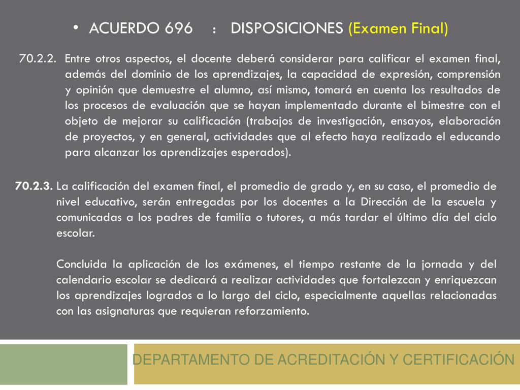 ACUERDO 696 : DISPOSICIONES (Examen Final) 70.2.2. Entre otros aspectos, el docente deberá considerar para calificar el examen final, además del dominio de los aprendizajes, la capacidad de expresión, comprensión y opinión que demuestre el alumno, así mismo, tomará en cuenta los resultados de los procesos de evaluación que se hayan implementado durante el bimestre con el objeto de mejorar su calificación (trabajos de investigación, ensayos, elaboración de proyectos, y en general, actividades que al efecto haya realizado el educando para alcanzar los aprendizajes esperados). 70.2.3. La calificación del examen final, el promedio de grado y, en su caso, el promedio de nivel educativo, serán entregadas por los docentes a la Dirección de la escuela y comunicadas a los padres de familia o tutores, a más tardar el último día del ciclo escolar. Concluida la aplicación de los exámenes, el tiempo restante de la jornada y del calendario escolar se dedicará a realizar actividades que fortalezcan y enriquezcan los aprendizajes logrados a lo largo del ciclo, especialmente aquellas relacionadas con las asignaturas que requieran reforzamiento. DEPARTAMENTO DE ACREDITACIÓN Y CERTIFICACIÓN