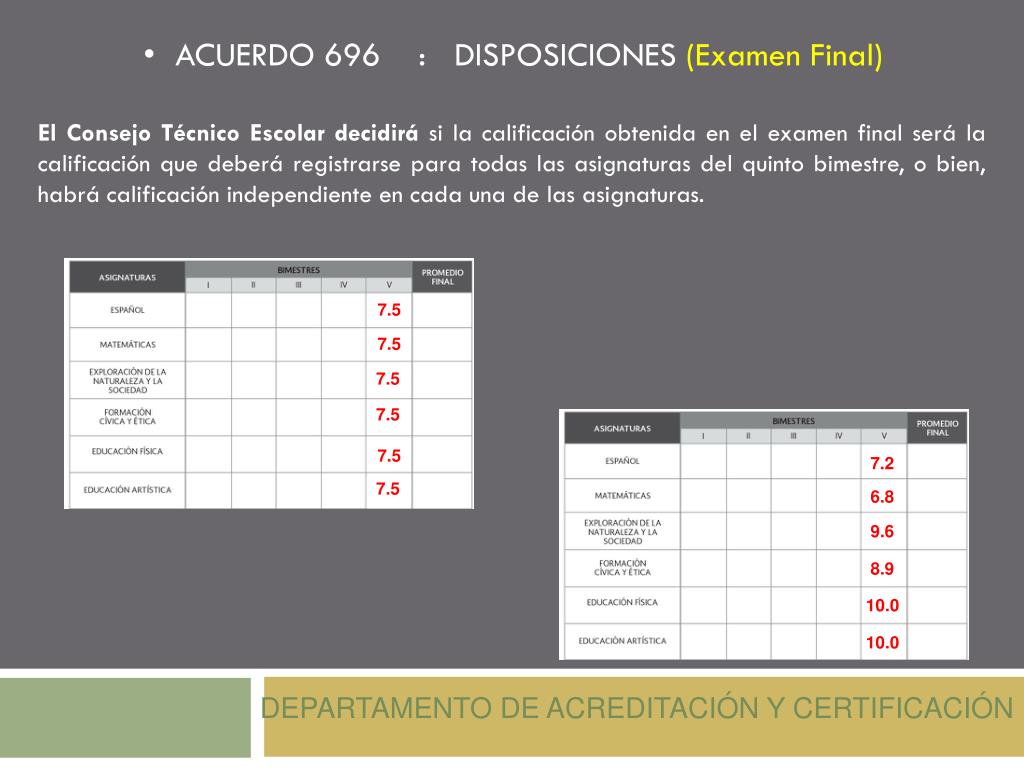ACUERDO 696 : DISPOSICIONES (Examen Final) El Consejo Técnico Escolar decidirá si la calificación obtenida en el examen final será la calificación que deberá registrarse para todas las asignaturas del quinto bimestre, o bien, habrá calificación independiente en cada una de las asignaturas. 7.5 7.5 7.5 7.5 7.5 7.5 7.2 6.8 9.6 8.9 10.0 10.0 DEPARTAMENTO DE ACREDITACIÓN Y CERTIFICACIÓN