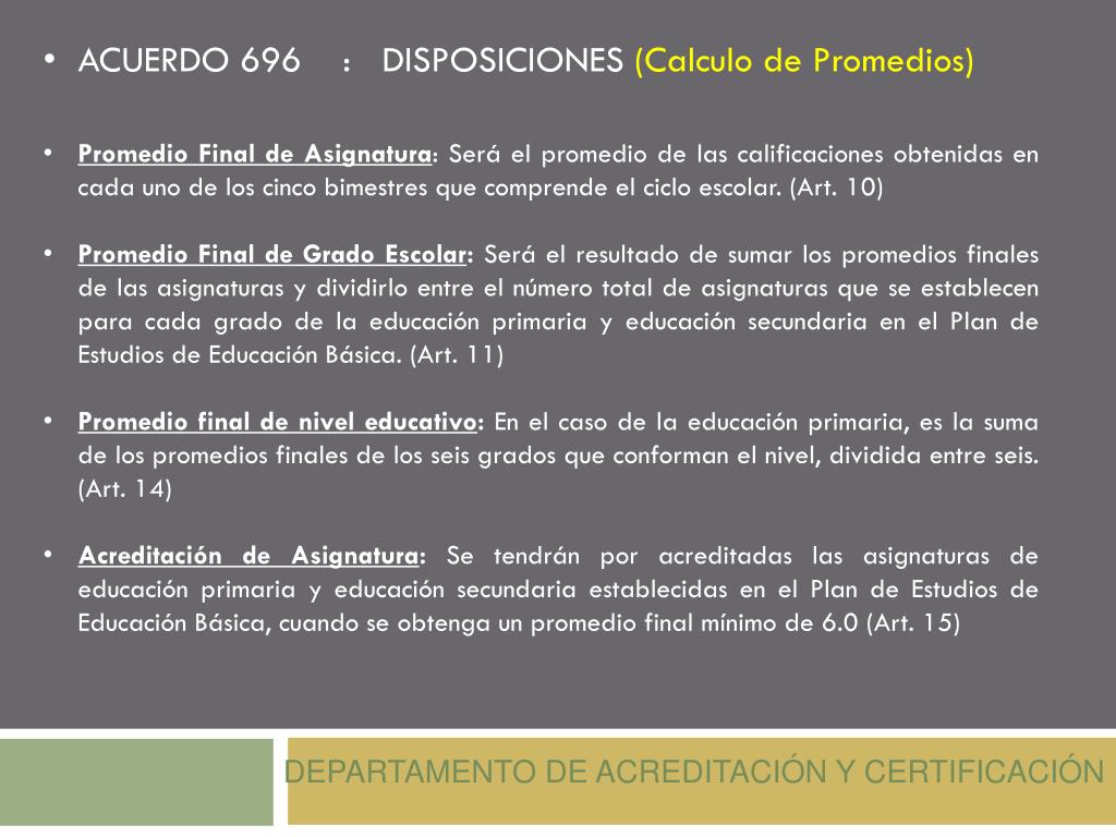 ACUERDO 696 : DISPOSICIONES (Calculo de Promedios) • Promedio Final de Asignatura: Será el promedio de las calificaciones obtenidas en cada uno de los cinco bimestres que comprende el ciclo escolar. (Art. 10) • Promedio Final de Grado Escolar: Será el resultado de sumar los promedios finales de las asignaturas y dividirlo entre el número total de asignaturas que se establecen para cada grado de la educación primaria y educación secundaria en el Plan de Estudios de Educación Básica. (Art. 11) • Promedio final de nivel educativo: En el caso de la educación primaria, es la suma de los promedios finales de los seis grados que conforman el nivel, dividida entre seis. (Art. 14) • Acreditación de Asignatura: Se tendrán por acreditadas las asignaturas de educación primaria y educación secundaria establecidas en el Plan de Estudios de Educación Básica, cuando se obtenga un promedio final mínimo de 6.0 (Art. 15) DEPARTAMENTO DE ACREDITACIÓN Y CERTIFICACIÓN