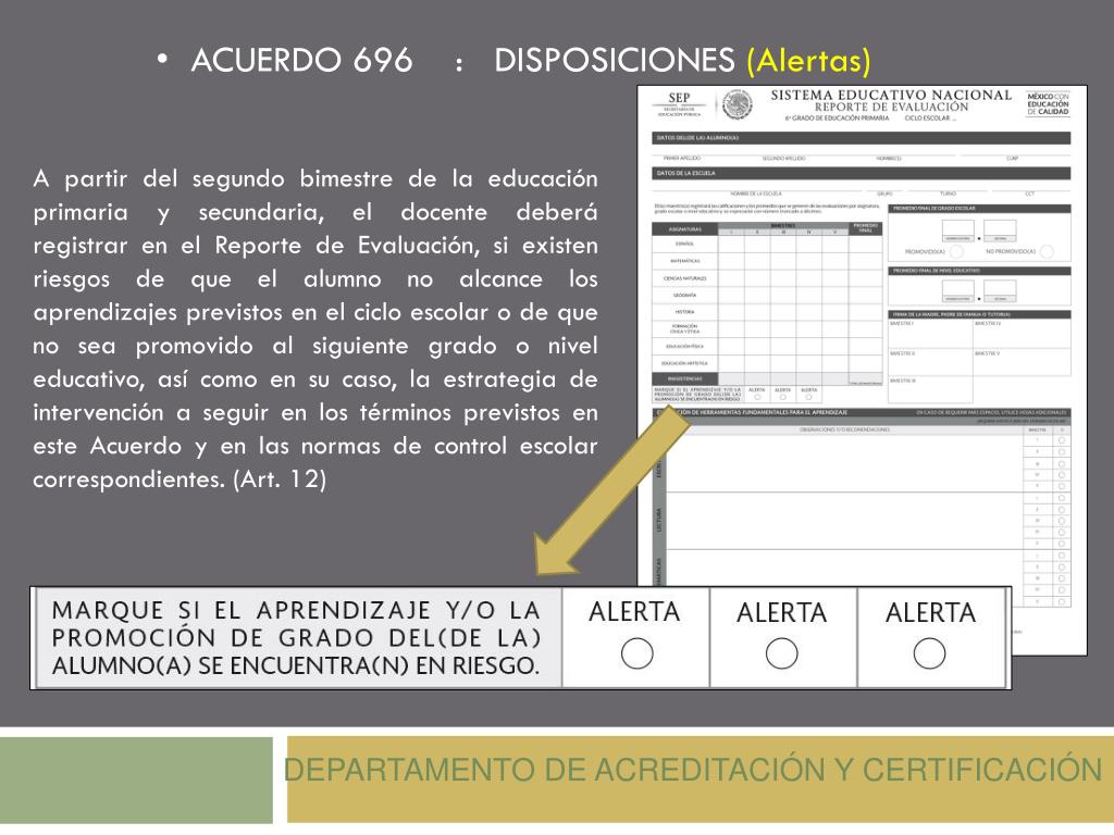 ACUERDO 696 : DISPOSICIONES (Alertas) A partir del segundo bimestre de la educación primaria y secundaria, el docente deberá registrar en el Reporte de Evaluación, si existen riesgos de que el alumno no alcance los aprendizajes previstos en el ciclo escolar o de que no sea promovido al siguiente grado o nivel educativo, así como en su caso, la estrategia de intervención a seguir en los términos previstos en este Acuerdo y en las normas de control escolar correspondientes. (Art. 12) DEPARTAMENTO DE ACREDITACIÓN Y CERTIFICACIÓN