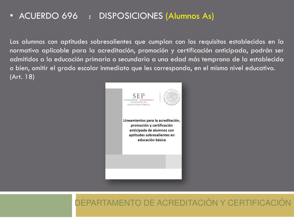 ACUERDO 696 : DISPOSICIONES (Alumnos As) Los alumnos con aptitudes sobresalientes que cumplan con los requisitos establecidos en la normativa aplicable para la acreditación, promoción y certificación anticipada, podrán ser admitidos a la educación primaria o secundaria a una edad más temprana de la establecida o bien, omitir el grado escolar inmediato que les corresponda, en el mismo nivel educativo. (Art. 18) DEPARTAMENTO DE ACREDITACIÓN Y CERTIFICACIÓN