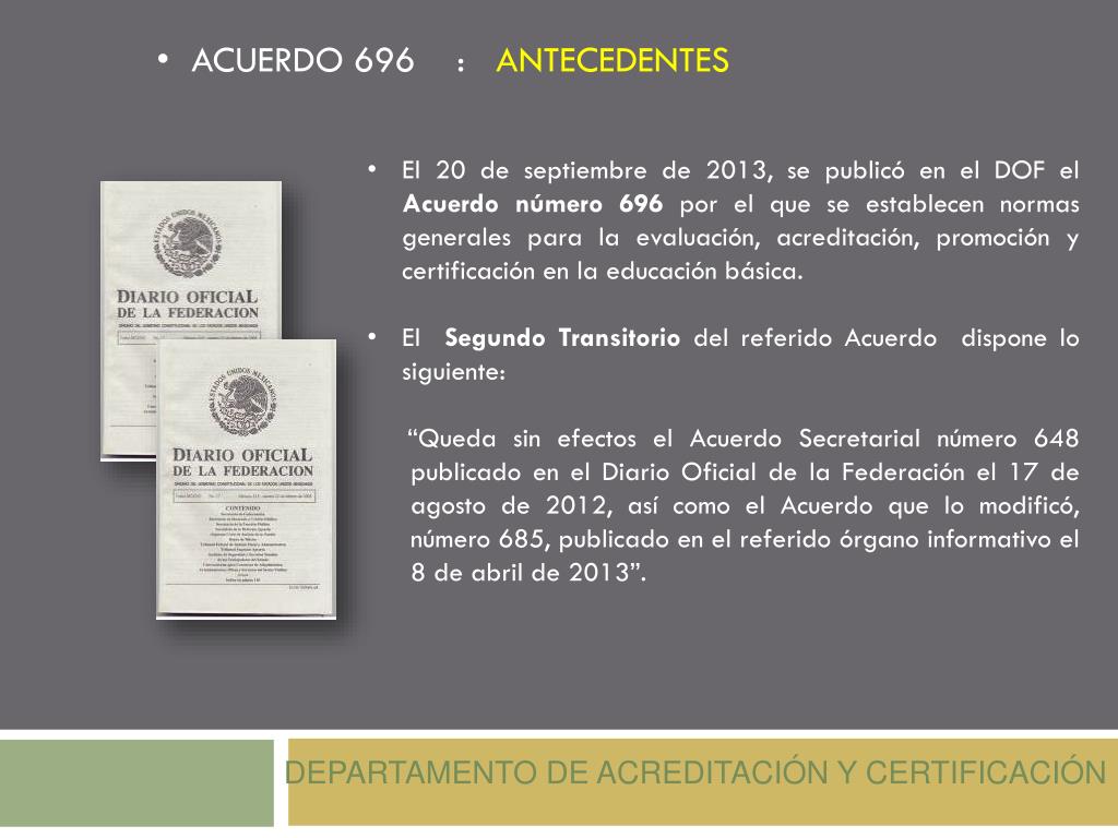 ACUERDO 696 : ANTECEDENTES • El 20 de septiembre de 2013, se publicó en el DOF el Acuerdo número 696 por el que se establecen normas generales para la evaluación, acreditación, promoción y certificación en la educación básica. • El Segundo Transitorio del referido Acuerdo dispone lo siguiente: • “Queda sin efectos el Acuerdo Secretarial número 648 publicado en el Diario Oficial de la Federación el 17 de agosto de 2012, así como el Acuerdo que lo modificó, número 685, publicado en el referido órgano informativo el 8 de abril de 2013”. DEPARTAMENTO DE ACREDITACIÓN Y CERTIFICACIÓN
