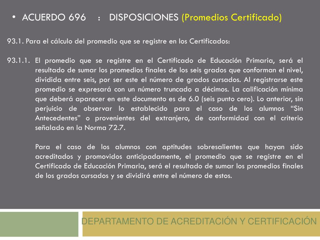 ACUERDO 696 : DISPOSICIONES (Promedios Certificado) 93.1. Para el cálculo del promedio que se registre en los Certificados: 93.1.1. El promedio que se registre en el Certificado de Educación Primaria, será el resultado de sumar los promedios finales de los seis grados que conforman el nivel, dividida entre seis, por ser este el número de grados cursados. Al registrarse este promedio se expresará con un número truncado a décimos. La calificación mínima que deberá aparecer en este documento es de 6.0 (seis punto cero). Lo anterior, sin perjuicio de observar lo establecido para el caso de los alumnos “Sin Antecedentes” o provenientes del extranjero, de conformidad con el criterio señalado en la Norma 72.7. Para el caso de los alumnos con aptitudes sobresalientes que hayan sido acreditados y promovidos anticipadamente, el promedio que se registre en el Certificado de Educación Primaria, será el resultado de sumar los promedios finales de los grados cursados y se dividirá entre el número de estos. DEPARTAMENTO DE ACREDITACIÓN Y CERTIFICACIÓN