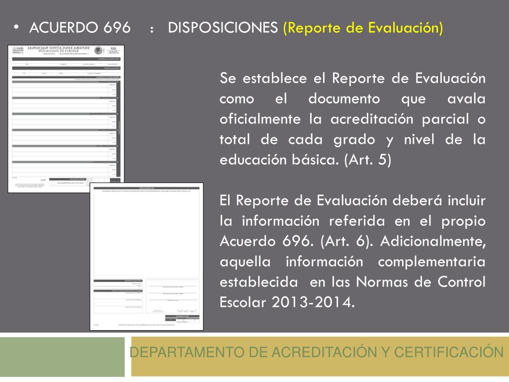 ACUERDO 696 : DISPOSICIONES (Reporte de Evaluación) Se establece el Reporte de Evaluación como el documento que avala oficialmente la acreditación parcial o total de cada grado y nivel de la educación básica. (Art. 5) El Reporte de Evaluación deberá incluir la información referida en el propio Acuerdo 696. (Art. 6). Adicionalmente, aquella información complementaria establecida en las Normas de Control Escolar 2013-2014. DEPARTAMENTO DE ACREDITACIÓN Y CERTIFICACIÓN