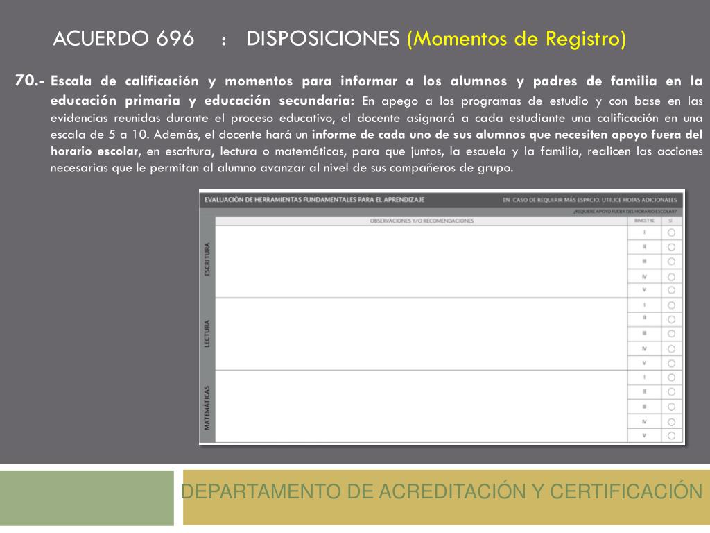 ACUERDO 696 : DISPOSICIONES (Momentos de Registro) 70.- Escala de calificación y momentos para informar a los alumnos y padres de familia en la educación primaria y educación secundaria: En apego a los programas de estudio y con base en las evidencias reunidas durante el proceso educativo, el docente asignará a cada estudiante una calificación en una escala de 5 a 10. Además, el docente hará un informe de cada uno de sus alumnos que necesiten apoyo fuera del horario escolar, en escritura, lectura o matemáticas, para que juntos, la escuela y la familia, realicen las acciones necesarias que le permitan al alumno avanzar al nivel de sus compañeros de grupo. DEPARTAMENTO DE ACREDITACIÓN Y CERTIFICACIÓN