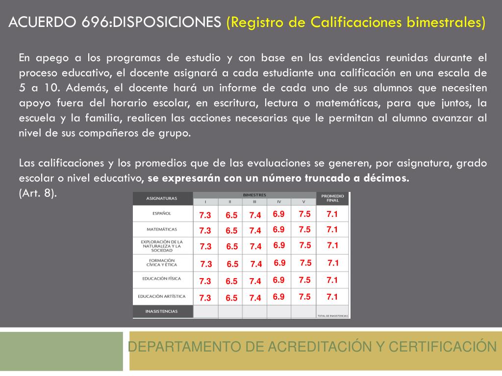 ACUERDO 696:DISPOSICIONES (Registro de Calificaciones bimestrales) En apego a los programas de estudio y con base en las evidencias reunidas durante el proceso educativo, el docente asignará a cada estudiante una calificación en una escala de 5 a 10. Además, el docente hará un informe de cada uno de sus alumnos que necesiten apoyo fuera del horario escolar, en escritura, lectura o matemáticas, para que juntos, la escuela y la familia, realicen las acciones necesarias que le permitan al alumno avanzar al nivel de sus compañeros de grupo. Las calificaciones y los promedios que de las evaluaciones se generen, por asignatura, grado escolar o nivel educativo, se expresarán con un número truncado a décimos. (Art. 8). 6.9 7.5 7.1 7.3 6.5 7.4 6.9 7.5 7.1 7.3 6.5 7.4 6.9 7.5 7.1 7.3 6.5 7.4 6.9 7.5 7.1 7.3 6.5 7.4 6.9 7.5 7.1 7.3 6.5 7.4 6.9 7.5 7.1 7.3 6.5 7.4 DEPARTAMENTO DE ACREDITACIÓN Y CERTIFICACIÓN