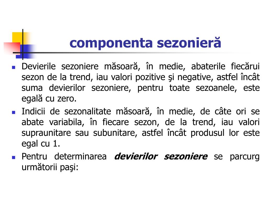 componenta sezonieră • Devierile sezoniere măsoară, în medie, abaterile fiecărui sezon de la trend, iau valori pozitive şi negative, astfel încât suma devierilor sezoniere, pentru toate sezoanele, este egală cu zero. • Indicii de sezonalitate măsoară, în medie, de câte ori se abate variabila, în fiecare sezon, de la trend, iau valori supraunitare sau subunitare, astfel încât produsul lor este egal cu 1. • Pentru determinarea devierilor sezoniere se parcurg următorii paşi:
