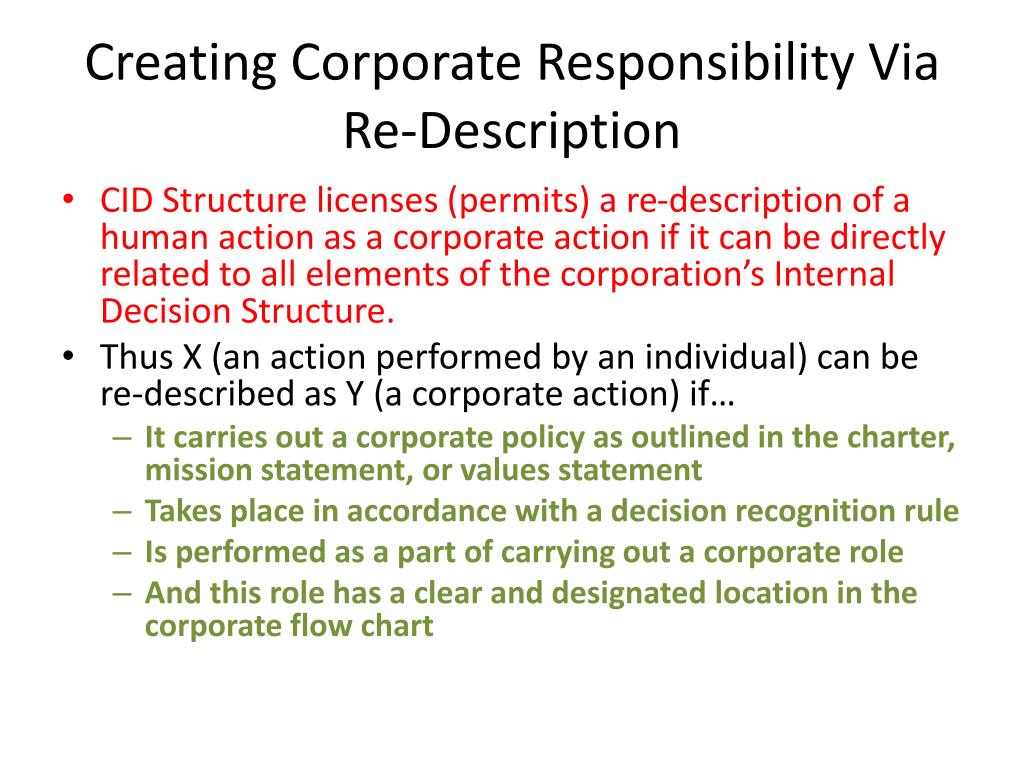 Creating Corporate Responsibility Via Re-Description • CID Structure licenses (permits) a re-description of a human action as a corporate action if it can be directly related to all elements of the corporation’s Internal Decision Structure. • Thus X (an action performed by an individual) can be re-described as Y (a corporate action) if… • It carries out a corporate policy as outlined in the charter, mission statement, or values statement • Takes place in accordance with a decision recognition rule • Is performed as a part of carrying out a corporate role • And this role has a clear and designated location in the corporate flow chart