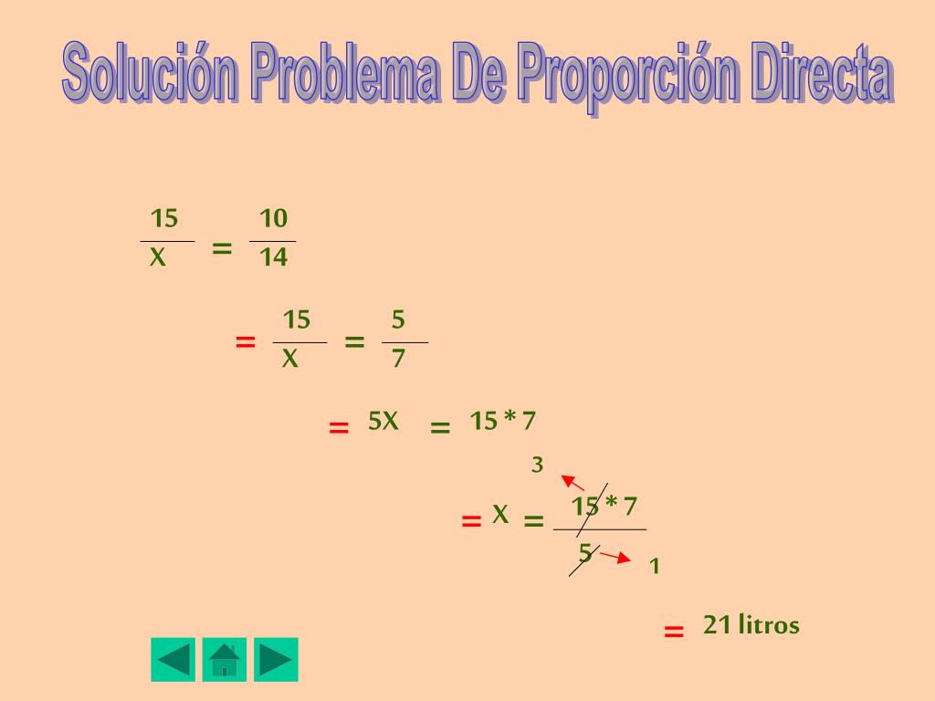 Solución Problema De Proporción Directa 15 10 = X 14 15 5 = = X 7 = 5X = 15 * 7 3 15 * 7 = X = 5 1 = 21 litros