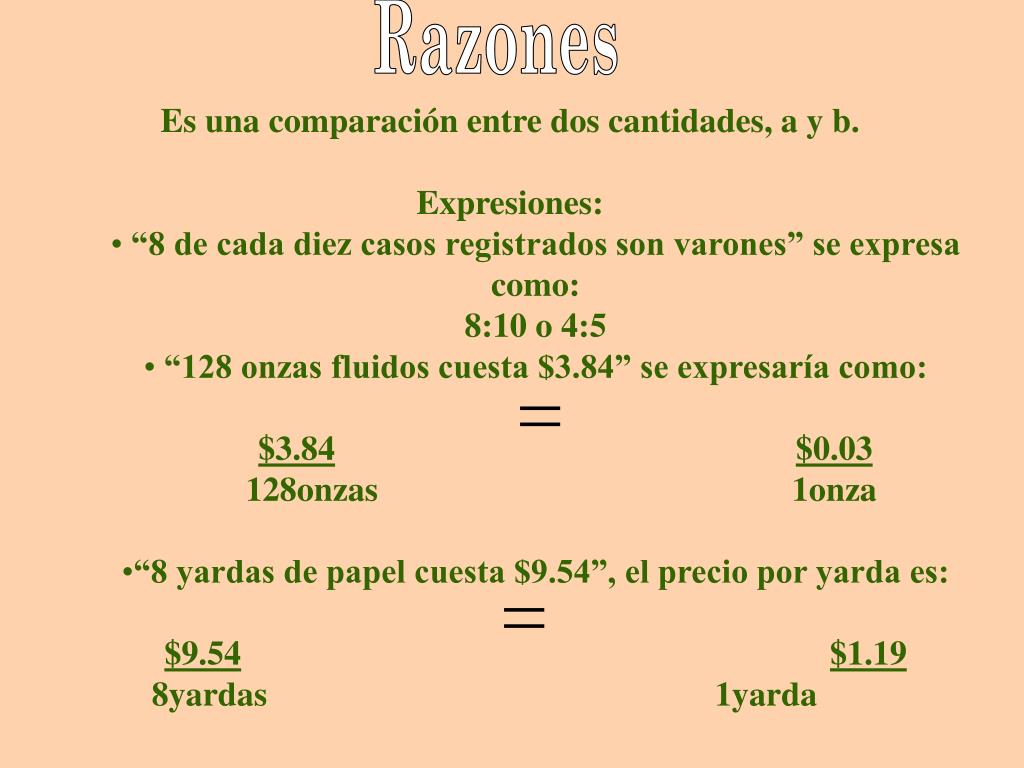 Razones • Es una comparación entre dos cantidades, a y b. • Expresiones: • “8 de cada diez casos registrados son varones” se expresa como: • 8:10 o 4:5 • “128 onzas fluidos cuesta $3.84” se expresaría como: • $3.84$0.03 128onzas 1onza • “8 yardas de papel cuesta $9.54”, el precio por yarda es: • $9.54$1.19 • 8yardas 1yarda