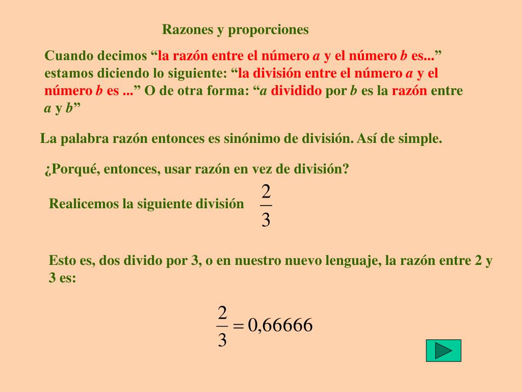 Razones y proporciones Cuando decimos “la razón entre el número a y el número b es...” estamos diciendo lo siguiente: “la división entre el número a y el número b es ...” O de otra forma: “adividido por b es la razón entre a y b” La palabra razón entonces es sinónimo de división. Así de simple. ¿Porqué, entonces, usar razón en vez de división? Realicemos la siguiente división Esto es, dos divido por 3, o en nuestro nuevo lenguaje, la razón entre 2 y 3 es: