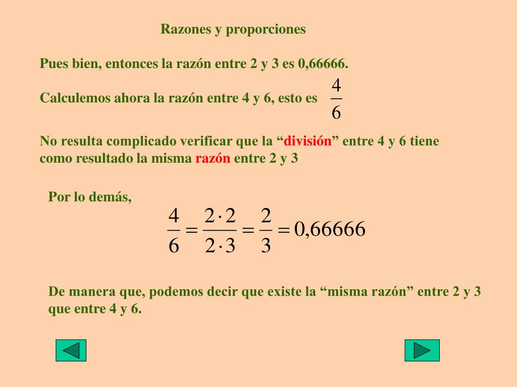 Razones y proporciones Pues bien, entonces la razón entre 2 y 3 es 0,66666. Calculemos ahora la razón entre 4 y 6, esto es No resulta complicado verificar que la “división” entre 4 y 6 tiene como resultado la misma razón entre 2 y 3 Por lo demás, De manera que, podemos decir que existe la “misma razón” entre 2 y 3 que entre 4 y 6.