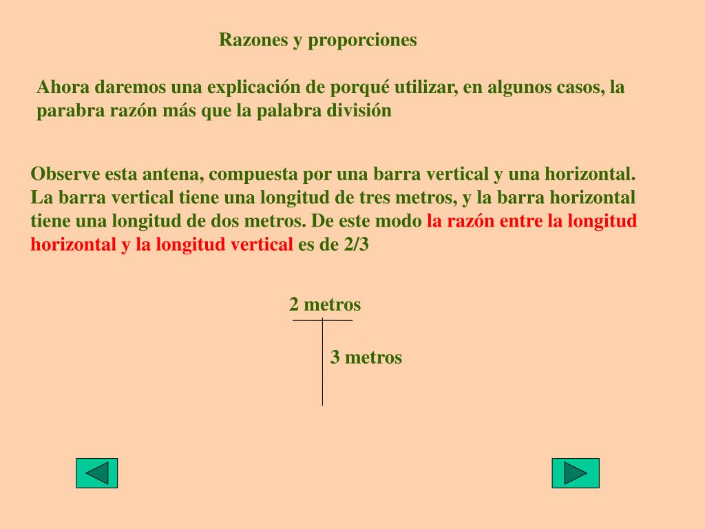 Razones y proporciones Ahora daremos una explicación de porqué utilizar, en algunos casos, la parabra razón más que la palabra división Observe esta antena, compuesta por una barra vertical y una horizontal. La barra vertical tiene una longitud de tres metros, y la barra horizontal tiene una longitud de dos metros. De este modo la razón entre la longitud horizontal y la longitud vertical es de 2/3 2 metros 3 metros