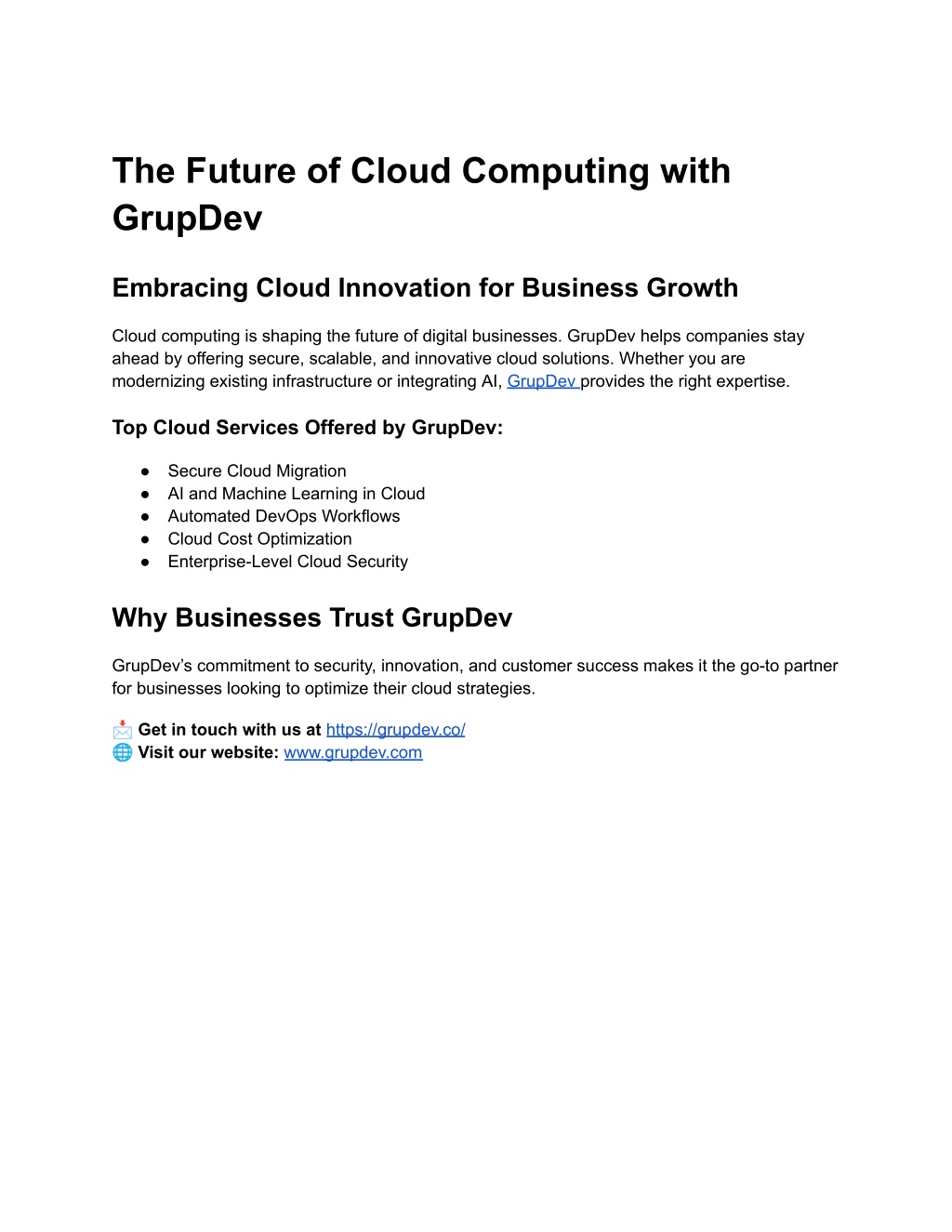 1. The Future of Cloud Computing with GrupDev Embracing Cloud Innovation for Business Growth Cloud computing is shaping the future of digital businesses. GrupDev helps companies stay ahead by offering secure, scalable, and innovative cloud solutions. Whether you are modernizing existing infrastructure or integrating AI, GrupDev provides the right expertise. Top Cloud Services Offered by GrupDev: ● Secure Cloud Migration ● AI and Machine Learning in Cloud ● Automated DevOps Workflows ● Cloud Cost Optimization ● Enterprise-Level Cloud Security Why Businesses Trust GrupDev GrupDev’s commitment to security, innovation, and customer success makes it the go-to partner for businesses looking to optimize their cloud strategies. ?Get in touch with us athttps://grupdev.co/ ?Visit our website:www.grupdev.com