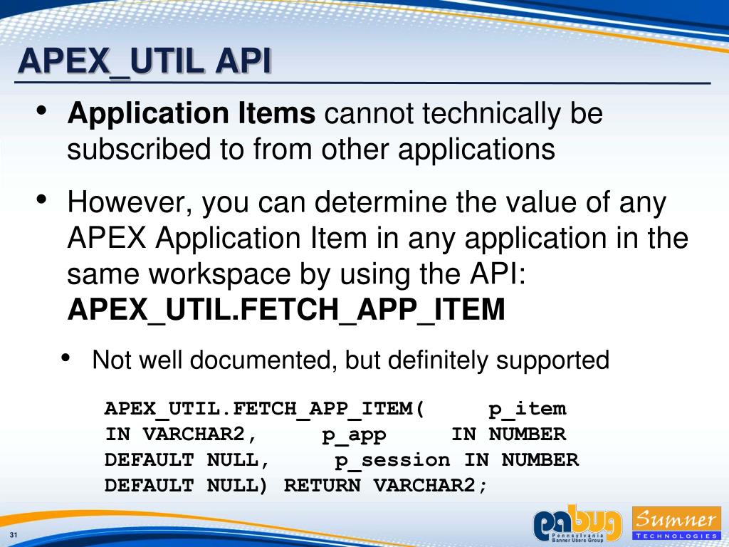 APEX_UTIL API • Application Items cannot technically be subscribed to from other applications • However, you can determine the value of any APEX Application Item in any application in the same workspace by using the API: APEX_UTIL.FETCH_APP_ITEM • Not well documented, but definitely supported APEX_UTIL.FETCH_APP_ITEM( p_item IN VARCHAR2, p_app IN NUMBER DEFAULT NULL, p_session IN NUMBER DEFAULT NULL) RETURN VARCHAR2;