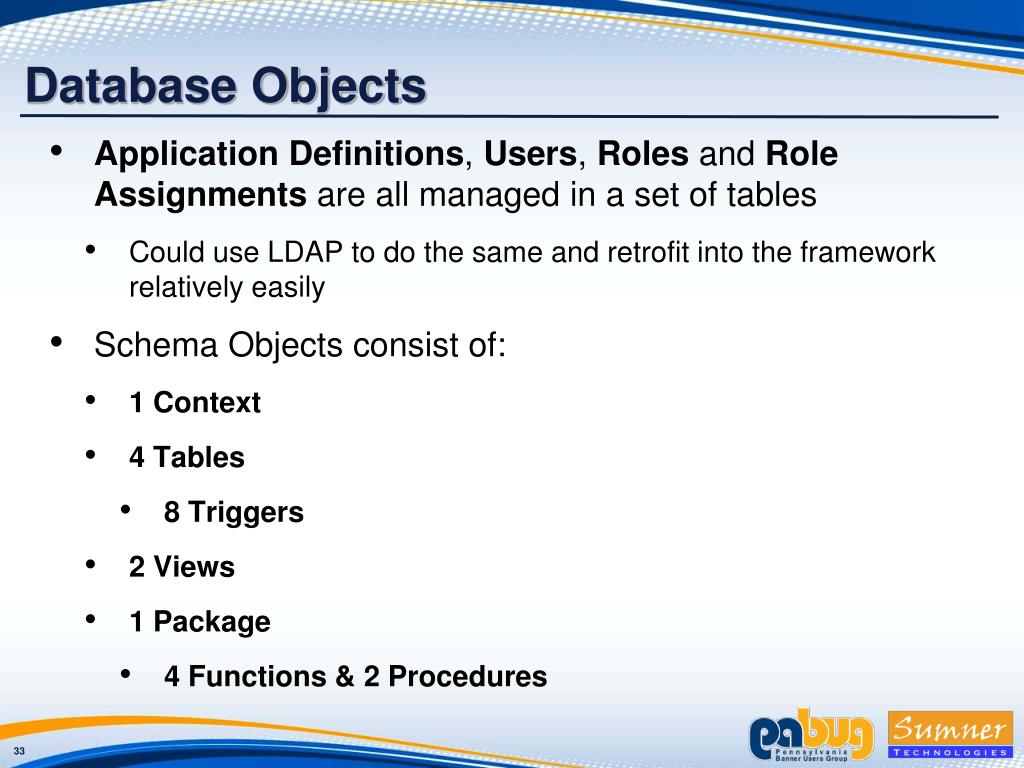 Database Objects • Application Definitions, Users, Roles and Role Assignments are all managed in a set of tables • Could use LDAP to do the same and retrofit into the framework relatively easily • Schema Objects consist of: • 1 Context • 4 Tables • 8 Triggers • 2 Views • 1 Package • 4 Functions & 2 Procedures