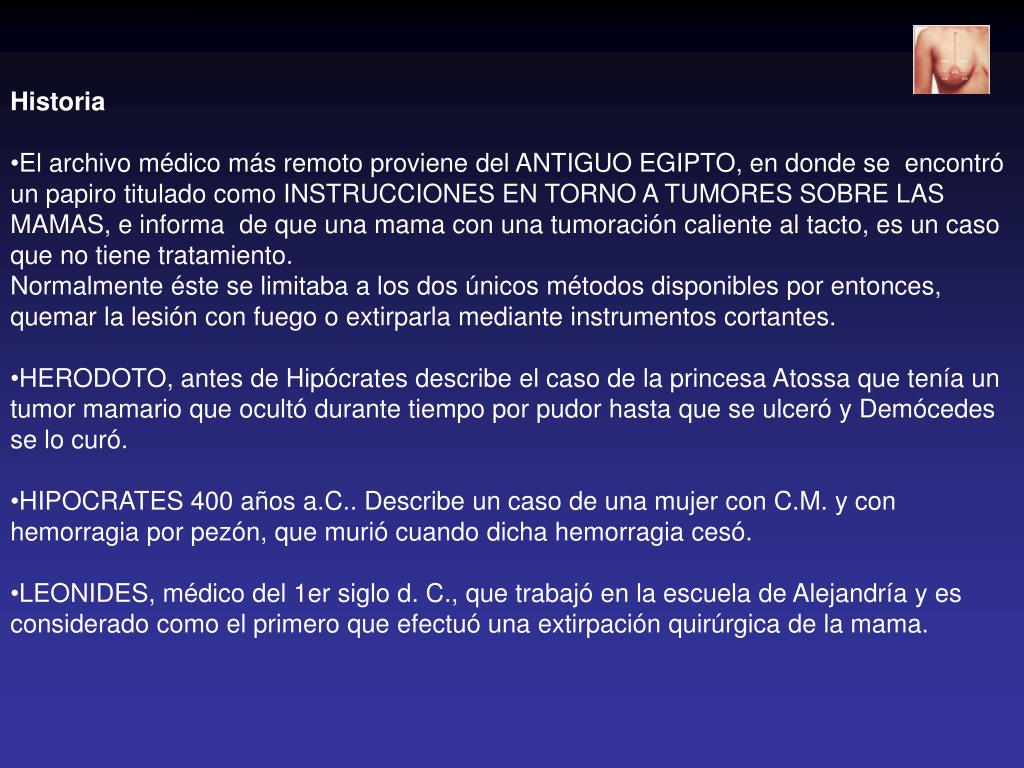 Historia • El archivo médico más remoto proviene del ANTIGUO EGIPTO, en donde se encontró un papiro titulado como INSTRUCCIONES EN TORNO A TUMORES SOBRE LAS MAMAS, e informa de que una mama con una tumoración caliente al tacto, es un caso que no tiene tratamiento. • Normalmente éste se limitaba a los dos únicos métodos disponibles por entonces, quemar la lesión con fuego o extirparla mediante instrumentos cortantes. • HERODOTO, antes de Hipócrates describe el caso de la princesa Atossa que tenía un tumor mamario que ocultó durante tiempo por pudor hasta que se ulceró y Demócedes se lo curó. • HIPOCRATES 400 años a.C.. Describe un caso de una mujer con C.M. y con hemorragia por pezón, que murió cuando dicha hemorragia cesó. • LEONIDES, médico del 1er siglo d. C., que trabajó en la escuela de Alejandría y es considerado como el primero que efectuó una extirpación quirúrgica de la mama.