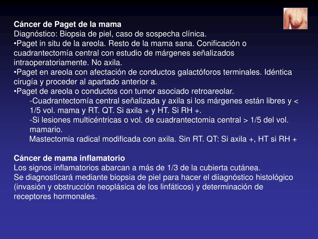 Cáncer de Paget de la mama • Diagnóstico: Biopsia de piel, caso de sospecha clínica. • Paget in situ de la areola. Resto de la mama sana. Conificación o cuadrantectomía central con estudio de márgenes señalizados intraoperatoriamente. No axila. • Paget en areola con afectación de conductos galactóforos terminales. Idéntica cirugía y proceder al apartado anterior a. • Paget de areola o conductos con tumor asociado retroareolar. • -Cuadrantectomía central señalizada y axila si los márgenes están libres y < 1/5 vol. mama y RT. QT. Si axila + y HT. Si RH +. • -Si lesiones multicéntricas o vol. de cuadrantectomia central > 1/5 del vol. mamario. • Mastectomia radical modificada con axila. Sin RT. QT: Si axila +, HT si RH + • Cáncer de mama inflamatorio • Los signos inflamatorios abarcan a más de 1/3 de la cubierta cutánea. • Se diagnosticará mediante biopsia de piel para hacer el diiagnóstico histológico (invasión y obstrucción neoplásica de los linfáticos) y determinación de receptores hormonales.