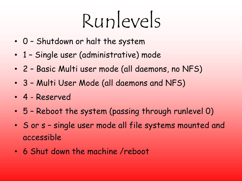 Runlevels • 0 – Shutdown or halt the system • 1 – Single user (administrative) mode • 2 – Basic Multi user mode (all daemons, no NFS) • 3 – Multi User Mode (all daemons and NFS) • 4 - Reserved • 5 – Reboot the system (passing through runlevel 0) • S or s – single user mode all file systems mounted and accessible • 6 Shut down the machine /reboot