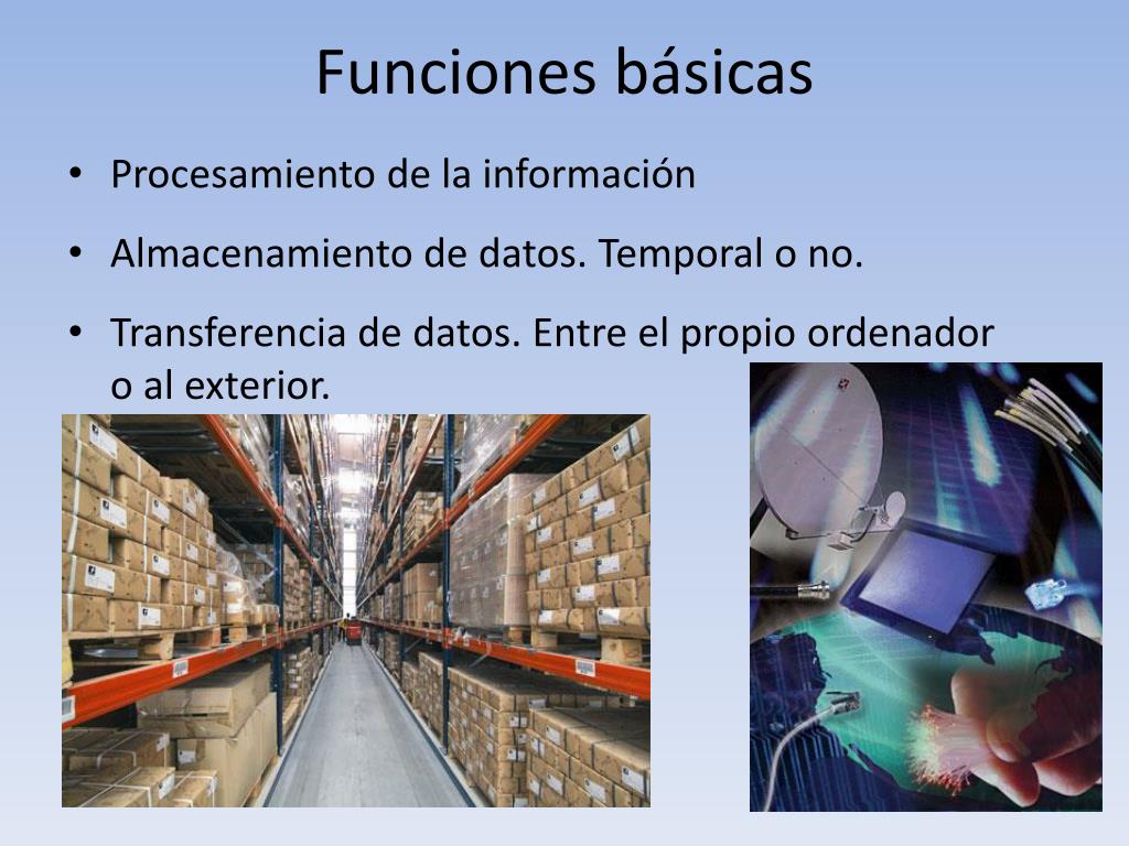 Funciones básicas • Procesamiento de la información • Almacenamiento de datos. Temporal o no. • Transferencia de datos. Entre el propio ordenador o al exterior.