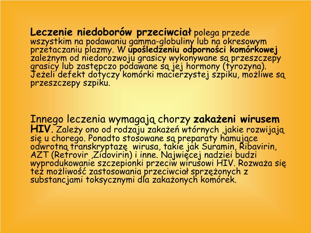 13. Leczenie niedoborów przeciwciał polega przede wszystkim na podawaniu gamma-globuliny lub na okresowym przetaczaniu plazmy. W upośledzeniu odporności komórkowej zależnym od niedorozwoju grasicy wykonywane są przeszczepy grasicy lub zastępczo podawane są jej hormony (tyrozyna). Jeżeli defekt dotyczy komórki macierzystej szpiku, możliwe są przeszczepy szpiku. Innego leczenia wymagają chorzy zakażeni wirusem HIV. Zależy ono od rodzaju zakażeń wtórnych ,jakie rozwijają się u chorego. Ponadto stosowane są preparaty hamujące odwrotną transkryptazę wirusa, takie jak Suramin, Ribavirin, AZT (Retrovir ,Zidovirin) i inne. Najwięcej nadziei budzi wyprodukowanie szczepionki przeciw wirusowi HIV. Rozważa się też możliwość zastosowania przeciwciał sprzężonych z substancjami toksycznymi dla zakażonych komórek.
