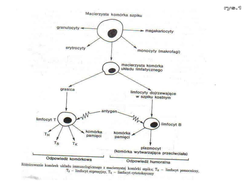 3. Układ immunologiczny(UI) kierujący procesami odpornościowymi składa się z narządu centralnego, tj. z grasicy, z narządów obwodowych takich jak śledziona, węzły chłonne, tkanka limfoidalna przewodu pokarmowego, oraz z ruchomych elementów, którymi są krążące komórki układu chłonnego (limfatycznego) i przeciwciała. „Zadaniem” układu immunologicznego jest: • rozpoznawanie antygenów własnych i odróżnianie ich od obcych, • zapewnienie integralności organizmu przez eliminację zmienionych komórek, własnych, które mogłyby zapoczątkować rozrost nowotworu lub zjawiska autoimmunizacyjne, • eliminacja komórek rozpoznawanych jako obce, • organizacja obrony przed zakażeniem .
