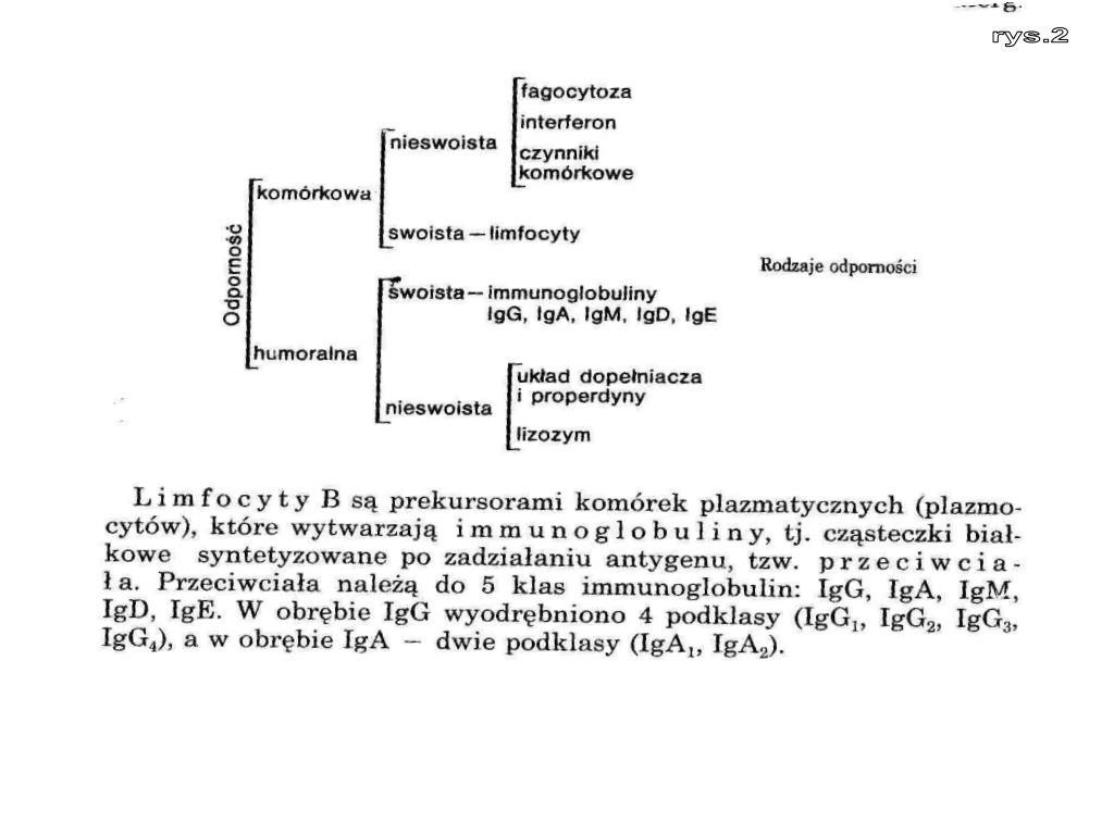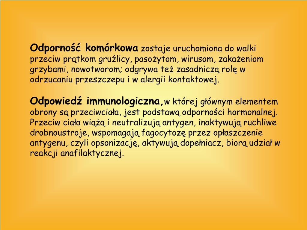 5. Odporność komórkowa zostaje uruchomiona do walki przeciw prątkom gruźlicy, pasożytom, wirusom, zakażeniom grzybami, nowotworom; odgrywa też zasadniczą rolę w odrzucaniu przeszczepu i w alergii kontaktowej.Odpowiedź immunologiczna,w której głównym elementem obrony są przeciwciała, jest podstawą odporności hormonalnej. Przeciw ciała wiążą i neutralizują antygen, inaktywują ruchliwe drobnoustroje, wspomagają fagocytozę przez opłaszczenie antygenu, czyli opsonizację, aktywują dopełniacz, biorą udział w reakcji anafilaktycznej.