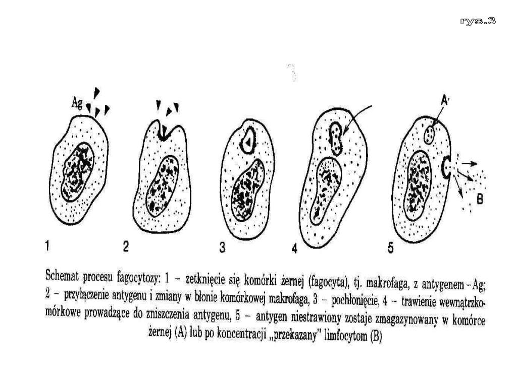 7. Fagocytoza, czyli pochłanianie drobnoustrojów lub różnych cząsteczek potencjalnie chorobotwórczych, ma ważne znaczenie w odporności ,zwłaszcza przeciw zakażeniom bakteryjnym. Przebieg fagocytozy ułatwiaopsonizacja ,czyli wiązanie na powierzchni komórki obcej składników zawartych w surowicy krwi, spełniających rolę opsonin (przeciwciałą IgM, IgG, białka dopełniacza, lizozym). Tak opłaszczone opsoninami cząsteczki łatwo ulegają fagocytozie. Odmianą fagocytozy jest pinocytoza, czyli pochłanianie płynów.Poszczególne stadia procesu fagocytozy przedstawione są na rysunku(rys3).
