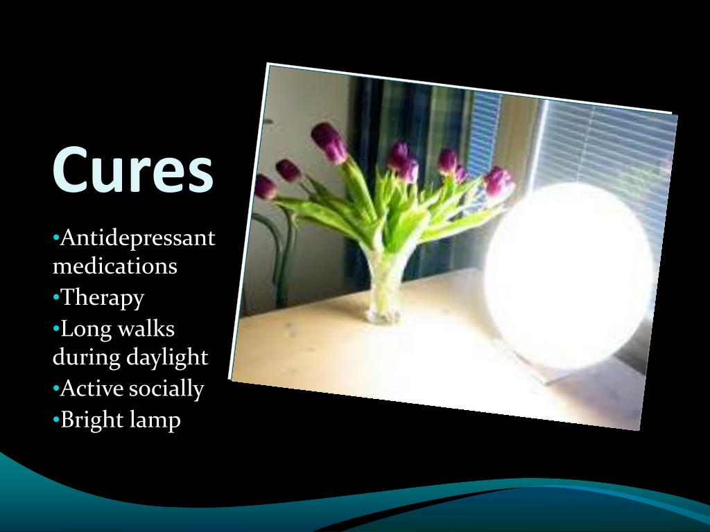 Cures Antidepressant medications Therapy Long walks during daylight Active socially Bright lamp