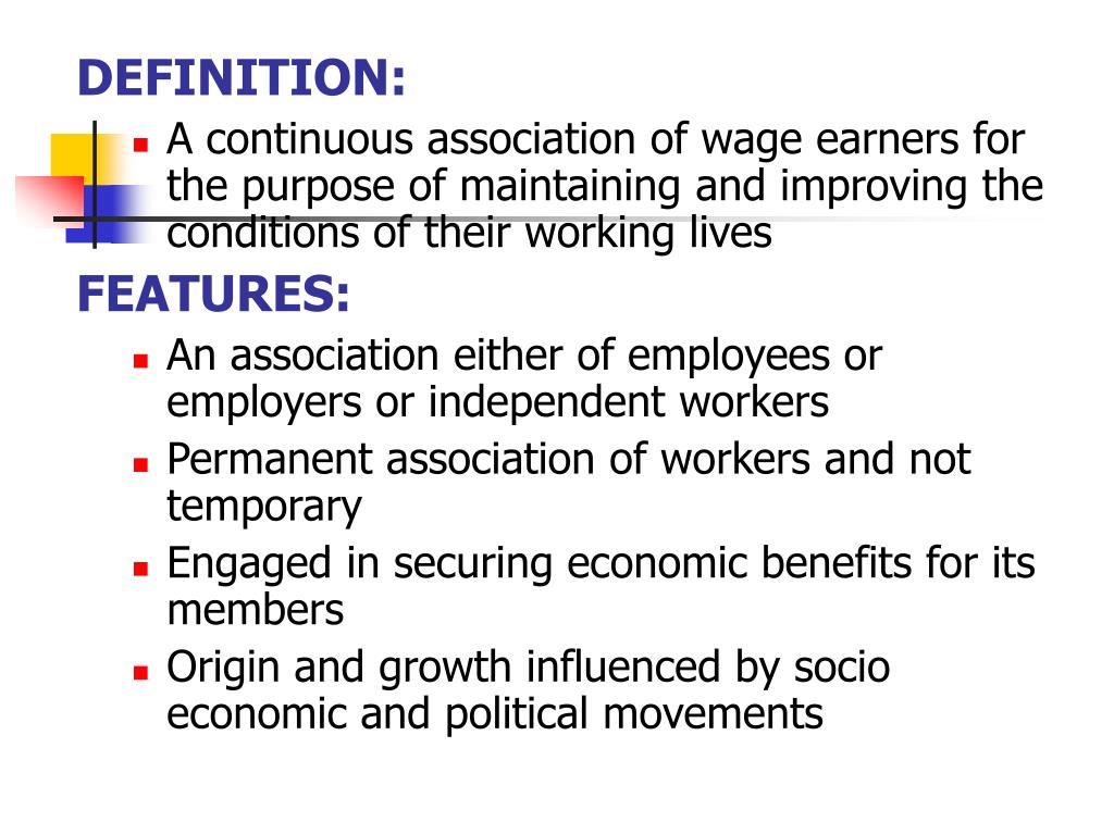 DEFINITION: • A continuous association of wage earners for the purpose of maintaining and improving the conditions of their working lives FEATURES: • An association either of employees or employers or independent workers • Permanent association of workers and not temporary • Engaged in securing economic benefits for its members • Origin and growth influenced by socio economic and political movements