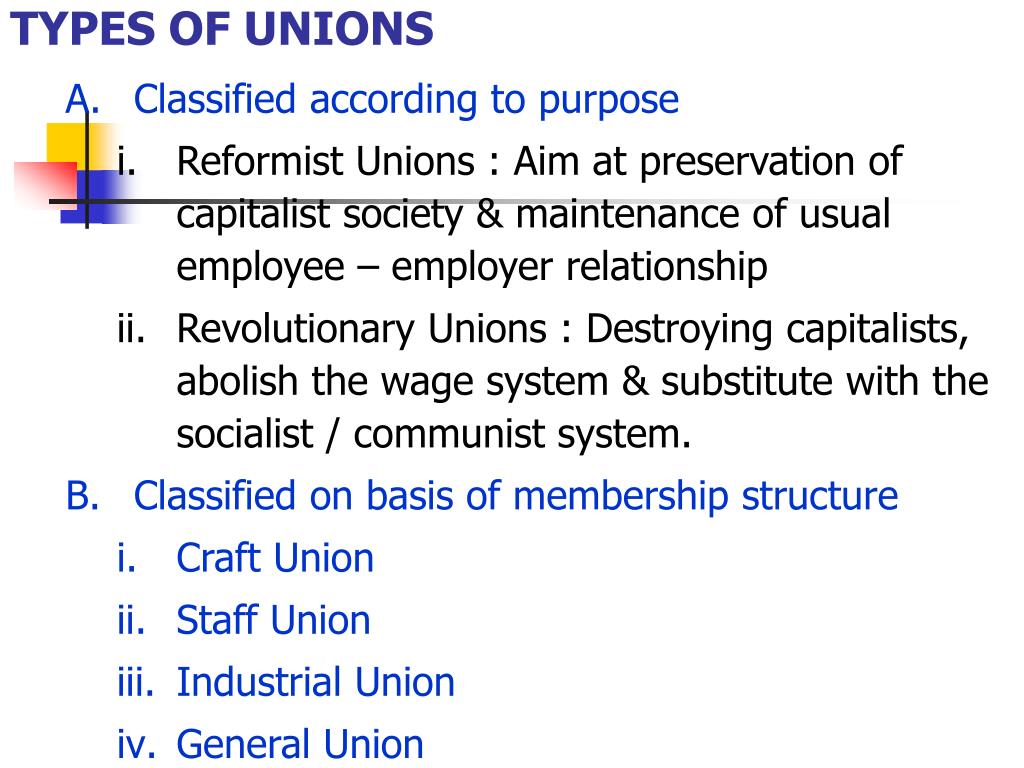 TYPES OF UNIONS • Classified according to purpose • Reformist Unions : Aim at preservation of capitalist society & maintenance of usual employee – employer relationship • Revolutionary Unions : Destroying capitalists, abolish the wage system & substitute with the socialist / communist system. • Classified on basis of membership structure • Craft Union • Staff Union • Industrial Union • General Union